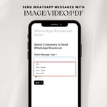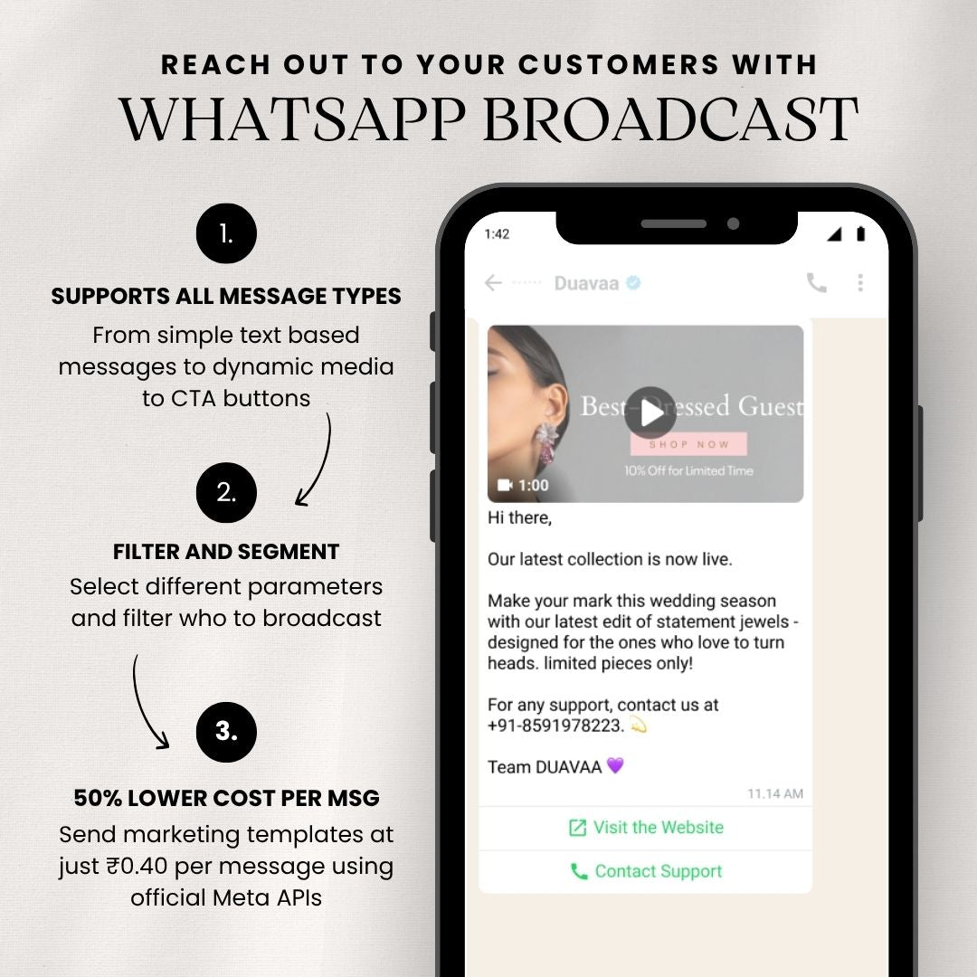 Send unlimited marketing messages, restock alerts, and offers to your customer list — all at 50% lower message costs. Personalise campaigns with images, videos, PDFs, or CTA buttons and deliver them straight to WhatsApp inboxes for instant engagement.