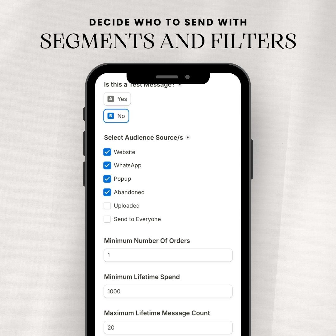 • Audience source (website, WhatsApp, popup, uploaded list, or abandoned cart)