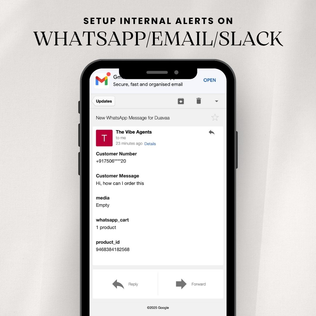 • Internal Alerts: Get notifications on WhatsApp, Email, or Slack for every new message